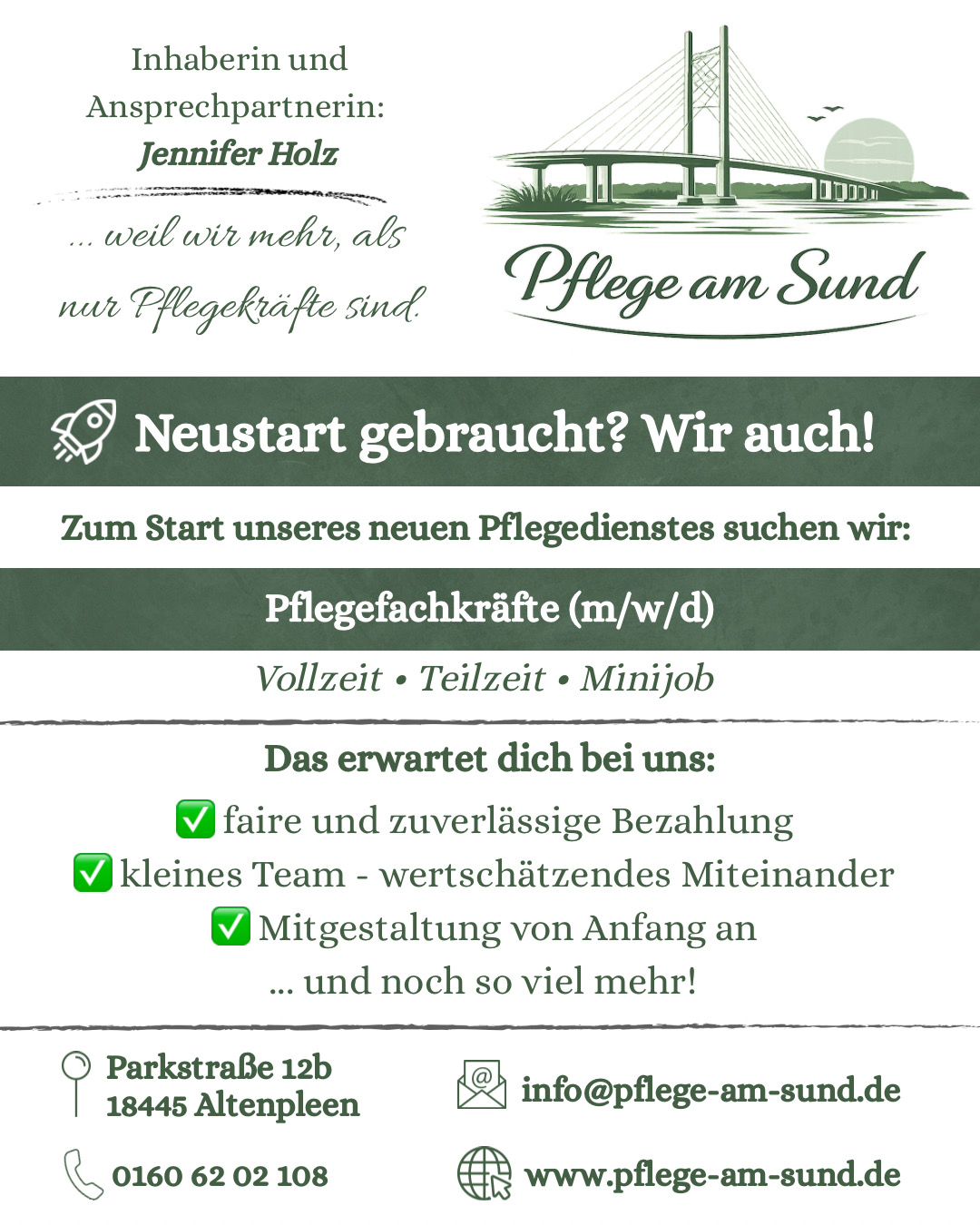 Als Inhaberin von Pflege am Sund bringe ich, Jennifer Holz, langjährige Erfahrung in der Pflege sowie eine fundierte Ausbildung als examinierte Pflegefachkraft, qualifizierte Praxisanleiterin und leitende Pflegefachkraft mit. Mir ist es besonders wichtig, jeden Menschen individuell zu sehen und die Pflege an die persönlichen Bedürfnisse, Wünsche und Lebensgewohnheiten anzupassen.